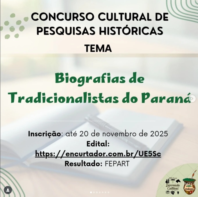Concurso Cultural de Pesquisas Históricas 2025 Publicado em 17 de Outubro de 2025 às 10:44 Documentos: Edital 05/2025 - Concurso Cultural de Pesquisas Históricas Facebook WhatsApp VEJA MAIS Concurso Estadual de Prendas e Peões 2026